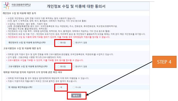 지원자 정보를 입력하고 확인하기 버튼을 클릭합니다.