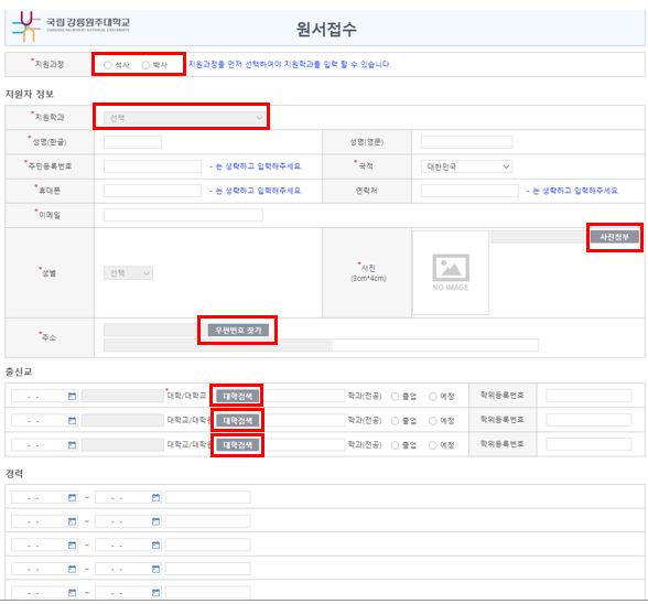지원학과 선택, 원서사진은 사진첨부 클릭, 주소는 우편번호 찾기를 클릭, 출신교 대학명 은 대학검색을 클릭하여 입력합니다.